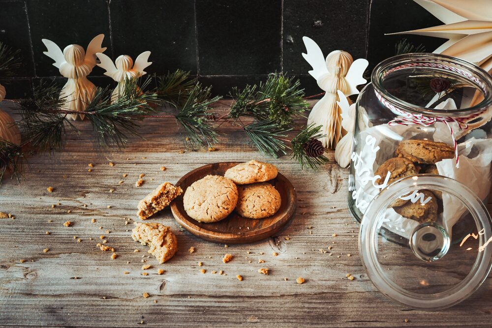 Das ist die Weihnachtsversion der Drömmar. Statt Vanille geben wir die typischen Pepperkakor-Gewürze zum Teig: Zimt, Ingwer, Nelke und Kardamom. Dazu der typische Geschmack des Hirschhornsalzes (minus des Ammoniaks), und zack hat man eine völlig andere Version des typisch schwedischen Pfefferkuchens. Nicht ganz so knusprig wie das Original, aber dafür sind sie auch viiiiiiel schneller gemacht. Statt Kochen, kneten und den Teig eine Nacht ruhen lassen liegen die fertigen Pepparkaksdrömmar ratzfatz auf dem Plätzchenteller. Oder im Plätzchenglas wie auf dem Bild.