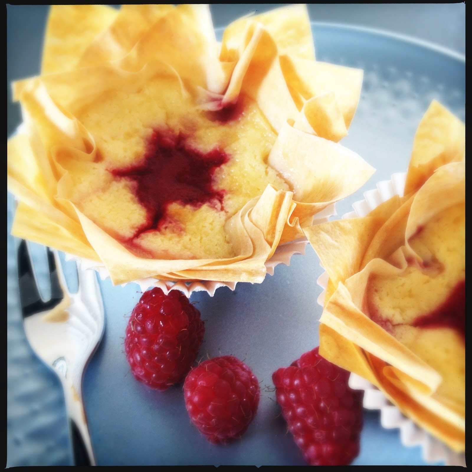 Als nächsten Schnitt die 12 Vertiefungen auf einem Muffinblech fetten und jeweils 4 Filoteig-Quadrate übereinander gelegt in die Form drücken (etwas versetzt). Einen Klecks Himbeerpürre auf den Boden geben, so ca. 1/2 EL (Nicht alles verbrauchen). Dann die Cheesecake-Masse drauf.