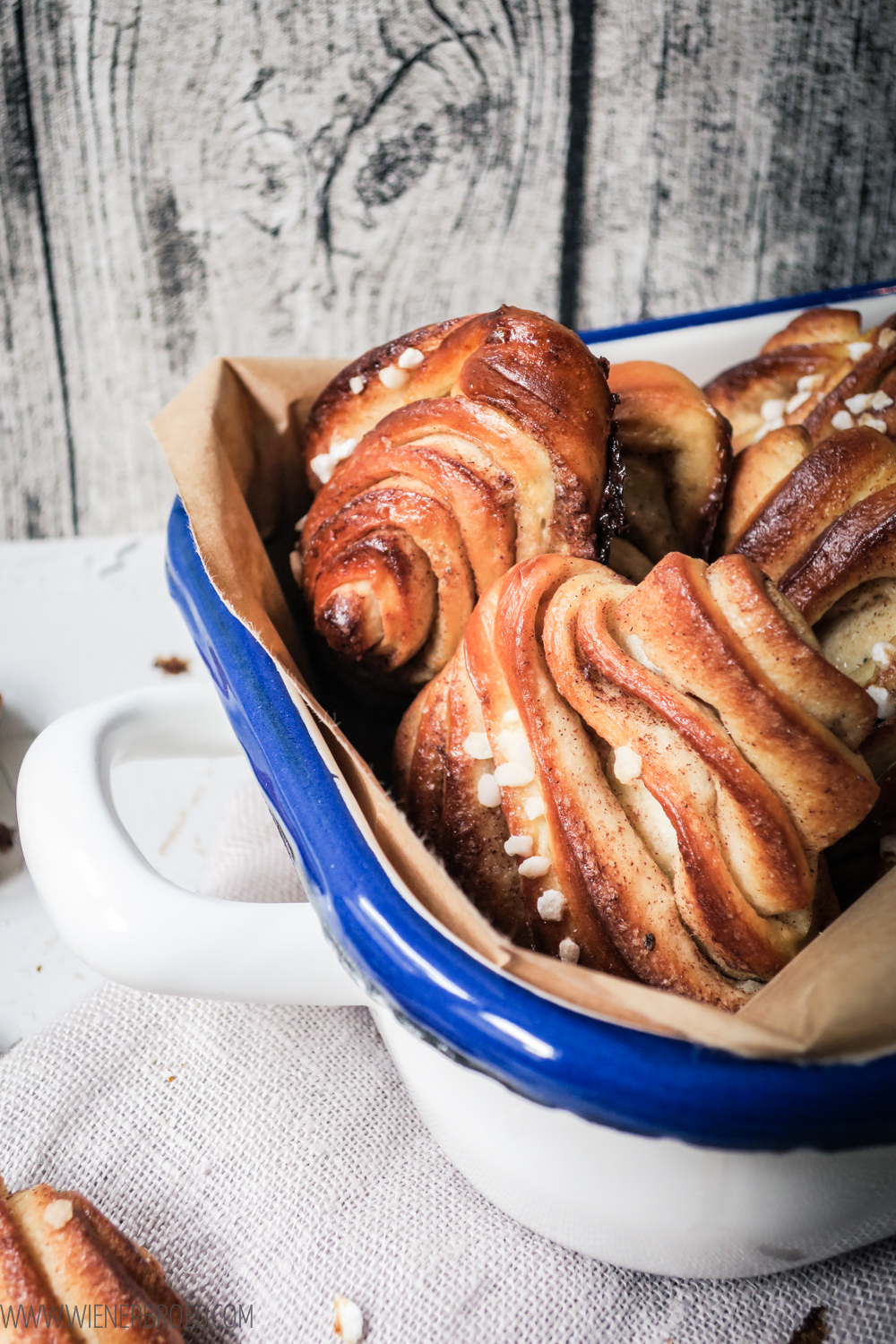 Korvapuusti, finnische Version der Zimtschnecken mit ordentlich Kardamom und besonderer Form / Korvapuusti, Finnish version of cinnamon buns with lots of cardamom and a special form [wienerbroed.com]