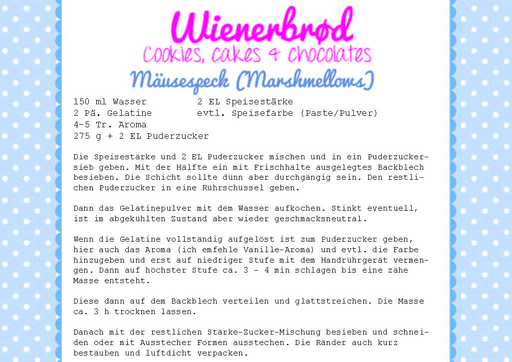 Und nun noch Leckerei Nummer 3: Määääääusespeck. Heute heißt das ja neudeutsch Marshmellows, aber es gibt noch die gleichen Sorten, rautenförmig mit zwei Farben, gedreht mit drei Farben, in einer Spitztüte. Welche Form und Farbe die Dinger auch haben, ich liebe sie heute noch. Und deshalb gab’s für Laura noch eine Tüte Mäusespeck.