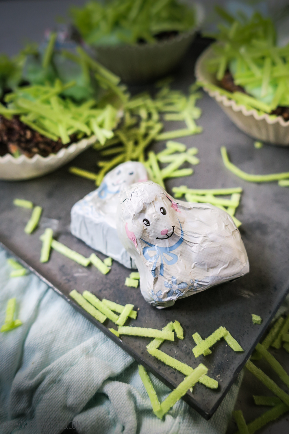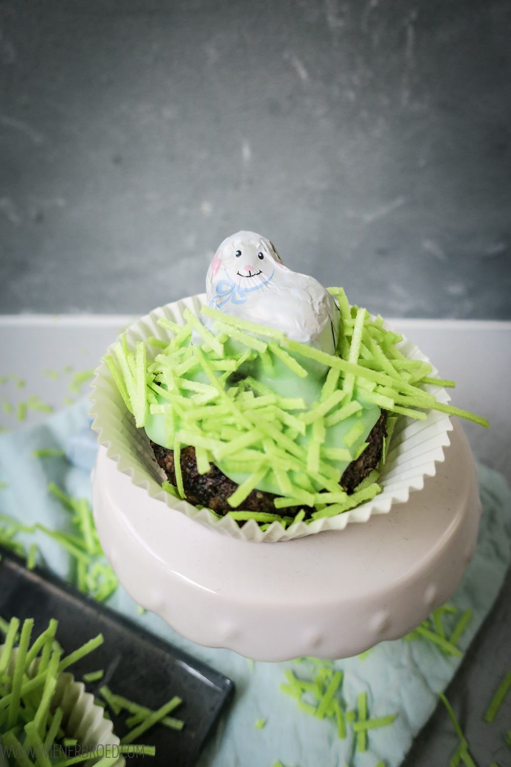 Ach, ich liebe, wenn eine Idee funktioniert! Und diese Idee hatte ich, als ich irgendwann dieses essbare Ostergras gesehen habe. Das ist ja nur grünes Esspapier in Streifen geschnitten. Aber macht doch echt was her, oder?