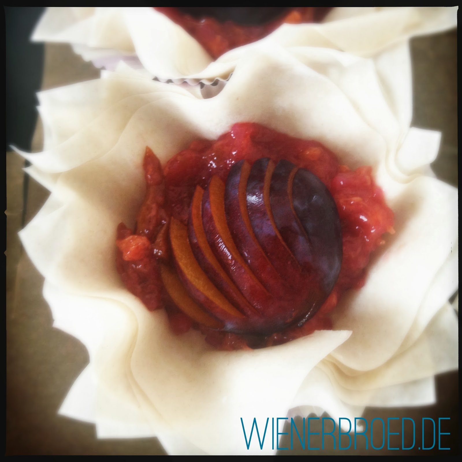 Im Kühlschrank lagen noch ein paar Blätter Filoteig, und was mit Käsekuchenmasseresten fuktioniert, funktioniert auch hervorragend mit Zwetschgenkompott! Also flugs einen Topf auf den Herd gestellt, und los ging es: