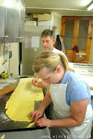 Aber nun zurück zum Curso di Dolci! Die Idee stand im Toskana-Führer unserer FeWo-Vermittlung. Klar, dass ich das auf jeden Fall machen wollte. Und so standen wir gegen Ende unseres Urlaubs 3 Stunden in der Backstube und ließen uns von Andrea in die Geheimnisse der italienischen Backkunst einführen. Mit Händen und Füßen sowie der tatkräftigen Unterstützung von Nachbarin Daniela als Übersetzerin wurde allerlei gezaubert und hin und wieder kam ich gar nicht mit dem Rezepte-Mitschreiben mit, so wirbelte Andrea von einer Köstlichkeit zur nächsten. Am Ende kamen aus dem Backofen leckere Blätterteig-Schleifen und gefüllte Sfogliatine (Blätterteig-Teilchen) für das Frühstück, herzhafte Cornetti für den Abend, eine Crostata mit leckerer Füllung für jederzeit und natürlich Cantuccini, dieses Mal in der Schoko-Variante. Andrea verriet mir sein Rezept für Puddingfüllungen, gab Tipps, wie ein Blätterteig auf jeden Fall gelingt und wies mich in seine Teig-Ausroll-Maschine ein (so ein Ding WILL ich auch haben!!!).