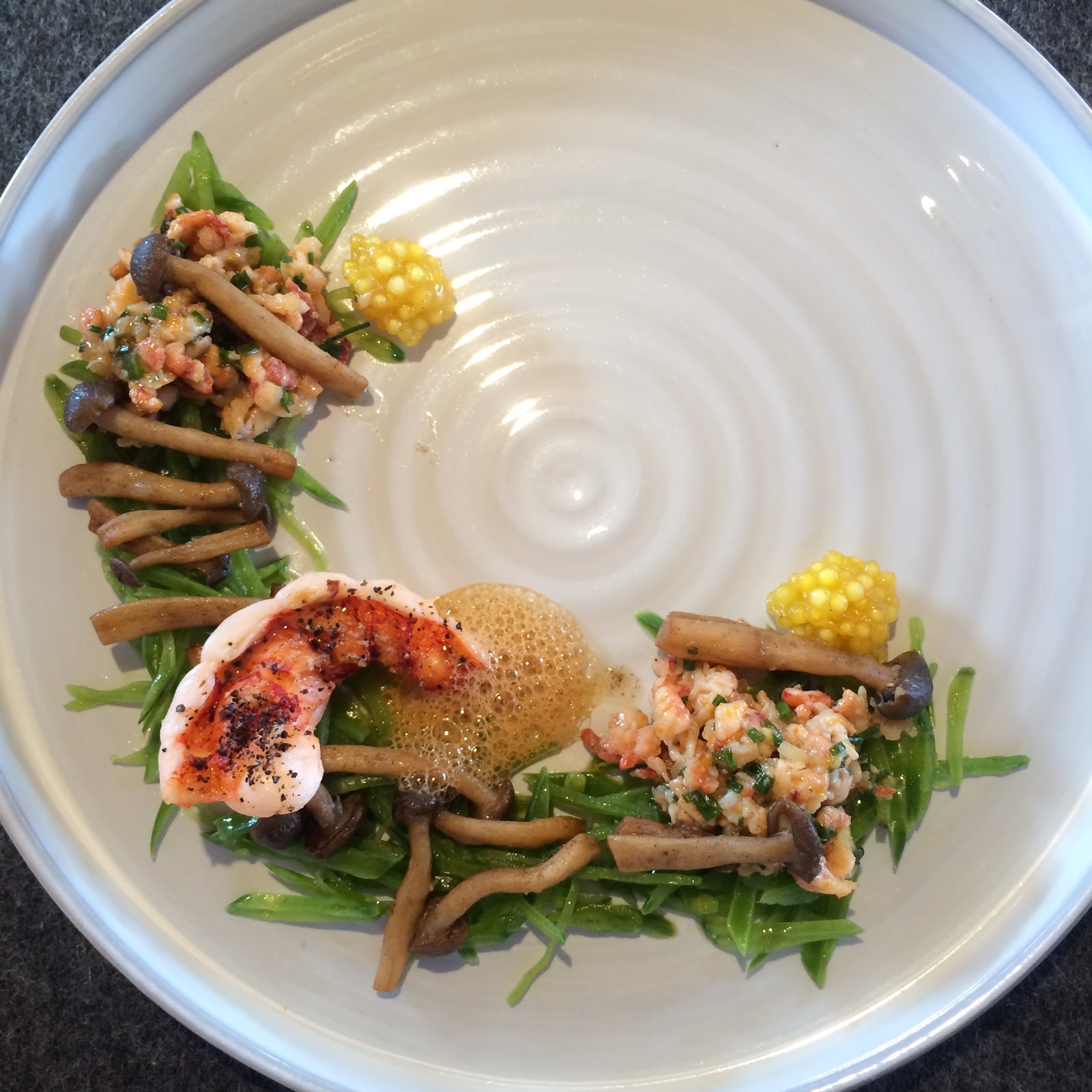 Dann ging es weiter mit der Vorspeise: Hummer mit Zuckerschotensalat (mmhmmmm!) und Buchenpilzen.